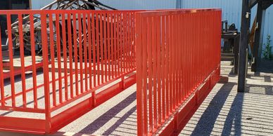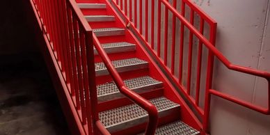Stairs are welded complete with grip strut treads, powder coated, and the hand rails are attached.